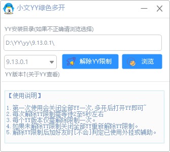 - 每个YY版本仅需解除限制一次,YY更新版本时软件自动获取新数据。