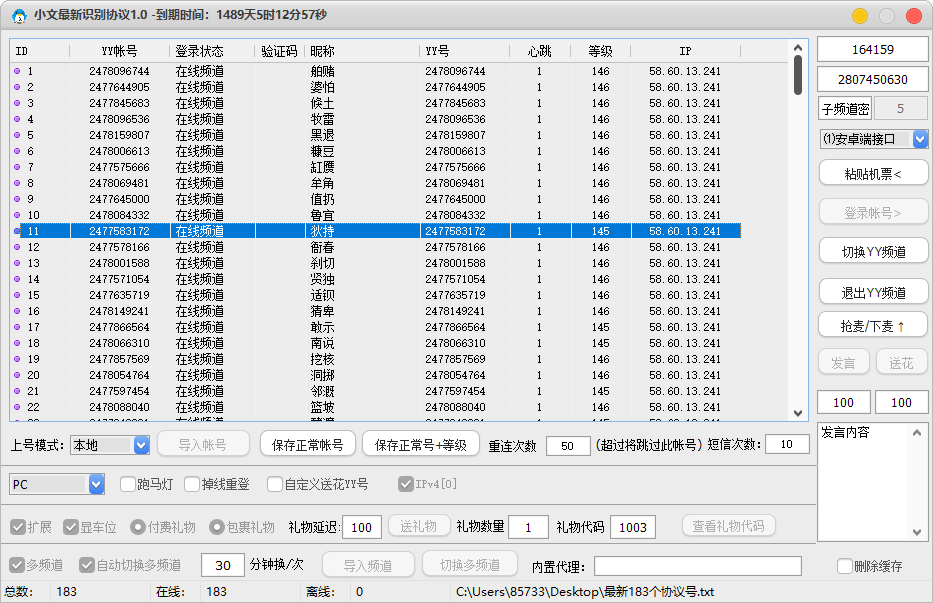 - 支持导入多频道/代挂号/赠送礼物/显示爵位车位/发言/送鲜花/保存各种类型帐号。