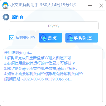 - 软件功能:(YY频道被封IP 可使用此软件无限解封: 使用方式请看软件内使用说明!)